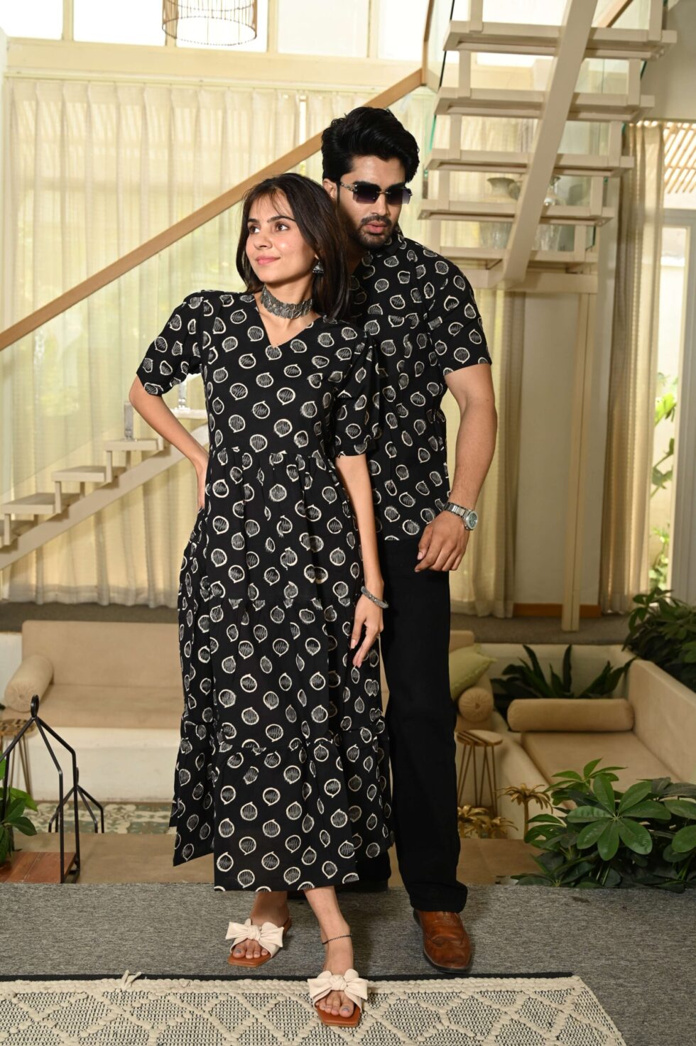 Stylish and coordinated red cotton couple outfit featuring vertical vine hand block prints. The breezy dress with a V-neck and the casual short-sleeve shirt make this a versatile duo for casual outings or festive gatherings.