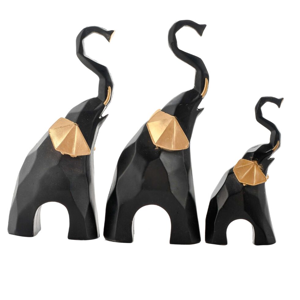 Transform your living space with the “Golden-Eared Triple Elephant Charm a set of three poly resin elephants in resplendent black with golden ears, each looking up in unison. These meticulously crafted figurines are designed to enhance your home dcor with a touch of Indian heritage and cultural significance. In varying sizes, from small to large, each elephant exudes elegance and charm, symbolizing wisdom and prosperity. In Indian tradition, elephants are revered as symbols of good luck and fortune, making this set not only visually appealing but also meaningful. Whether displayed in your living room, office, or given as a unique gift, these elephants infuse your space with a sense of elegance and a connection to Indian tradition. Each piece is a testament to quality craftsmanship, ensuring that they maintain their lasting beauty and appeal. Make a statement with this elegant ensemble or share the cultural significance of these elephants with a loved one. Experience the beauty and meaning they bring to your surroundings, creating an atmosphere of prosperity and good fortune.