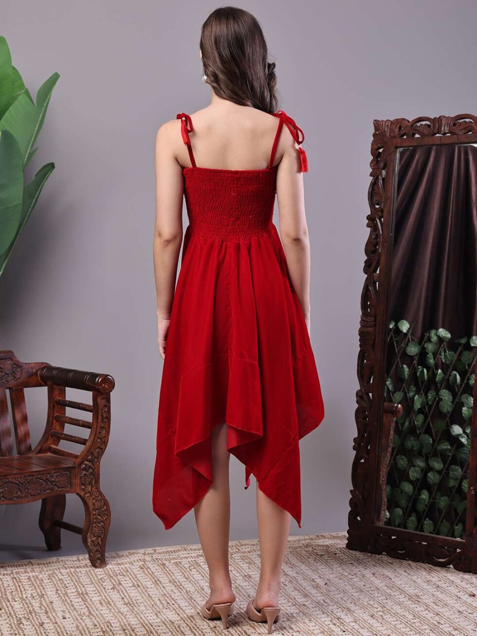 Effortlessly stylish dress with a vibrant abstract print, tie-up shoulder straps, and a chic high-low handkerchief hemline ? perfect for casual days or evening gatherings.