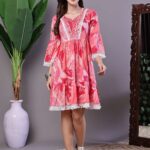 This stylish, tiered tunic mini-dress offers a beautiful flared silhouette with a playful, movement-filled skirt. It features an intricately detailed V-neckline with lace and threadwork, and is finished with a trendy fringe/tassel trim on the sleeves and hem. It’s a versatile and comfortable statement piece perfect for a modern bohemian look.