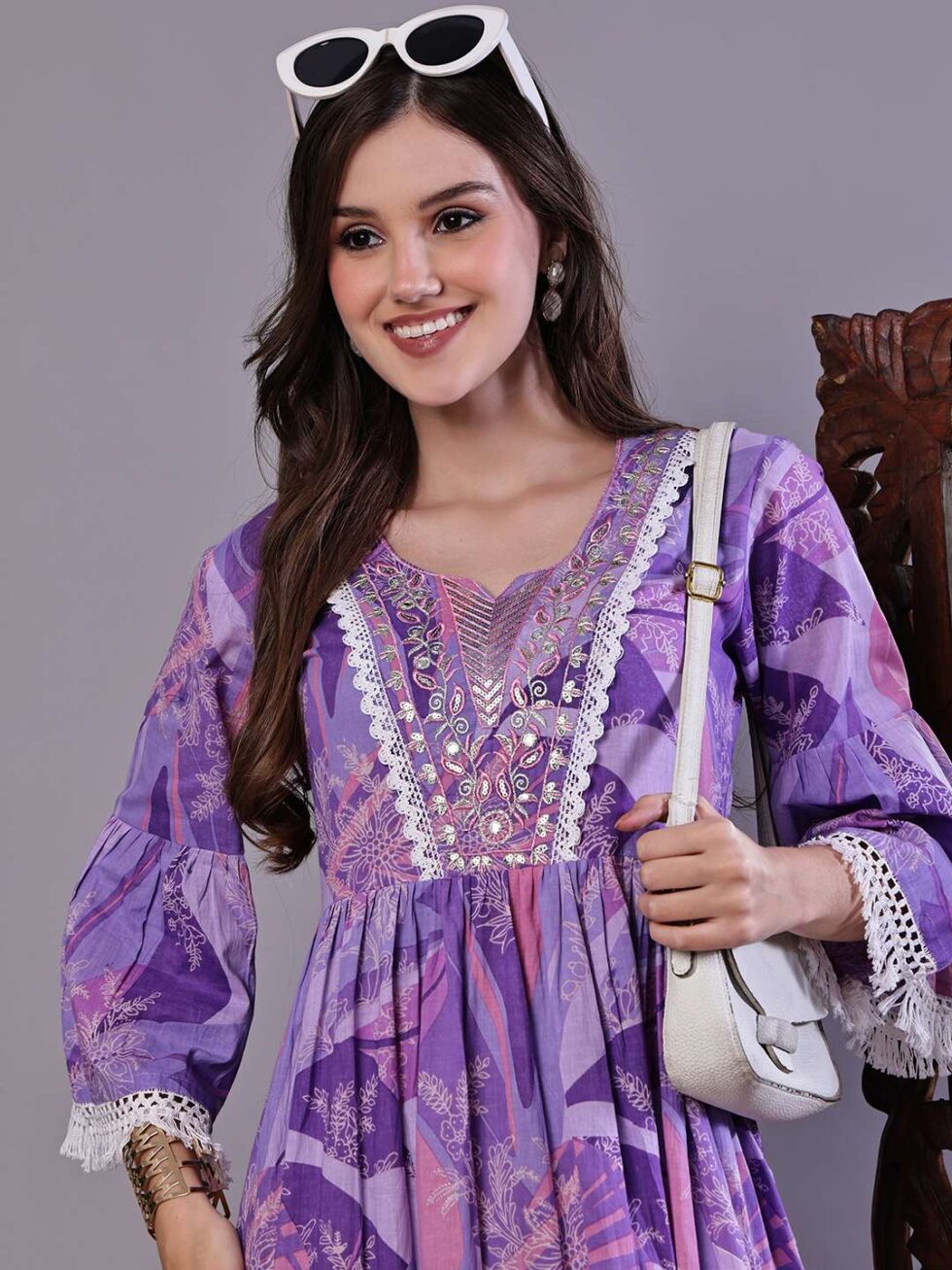 This stylish, tiered tunic mini-dress offers a beautiful flared silhouette with a playful, movement-filled skirt. It features an intricately detailed V-neckline with lace and threadwork, and is finished with a trendy fringe/tassel trim on the sleeves and hem. It’s a versatile and comfortable statement piece perfect for a modern bohemian look.